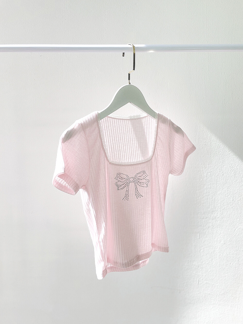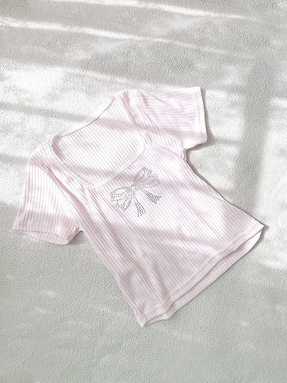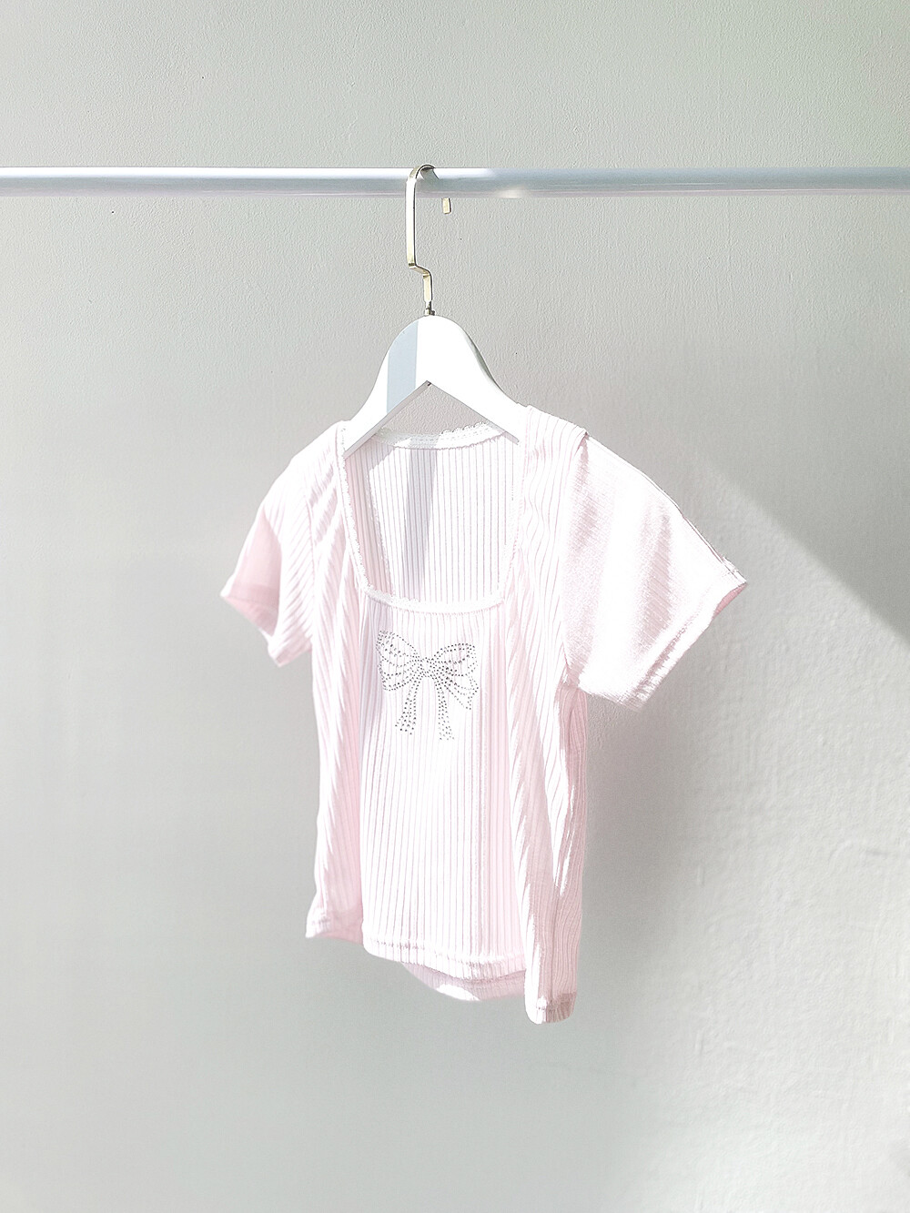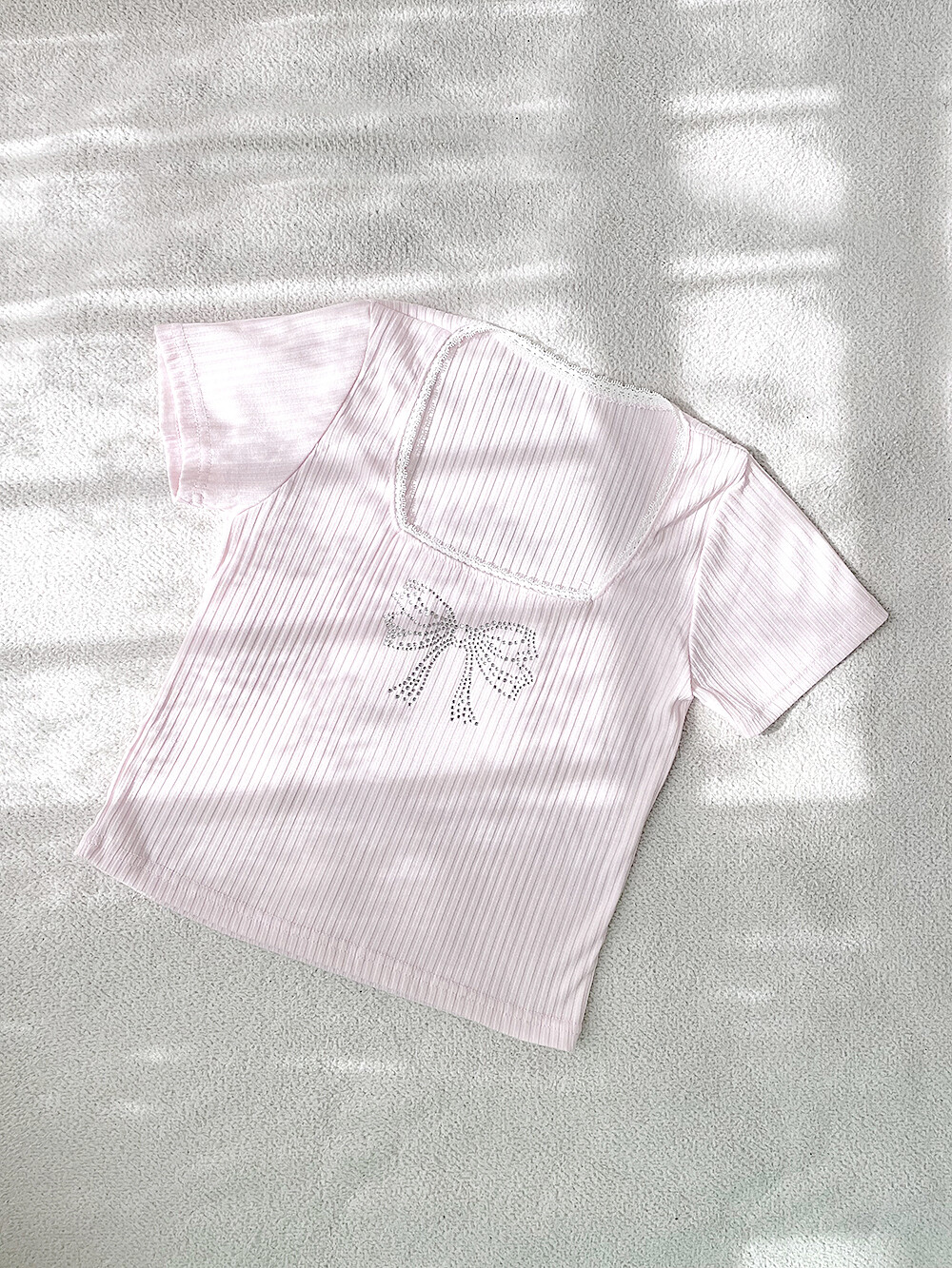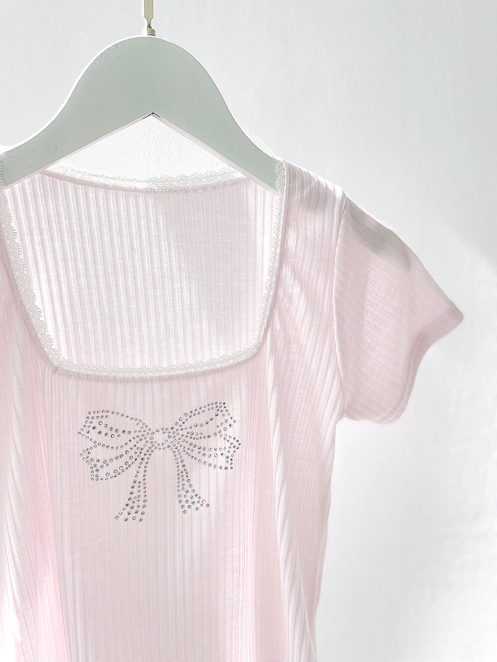 Shine Ribbon Cubic Lace T-Shirt (Baby Pink)