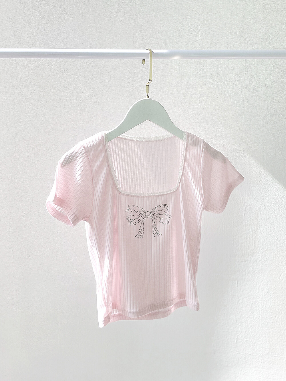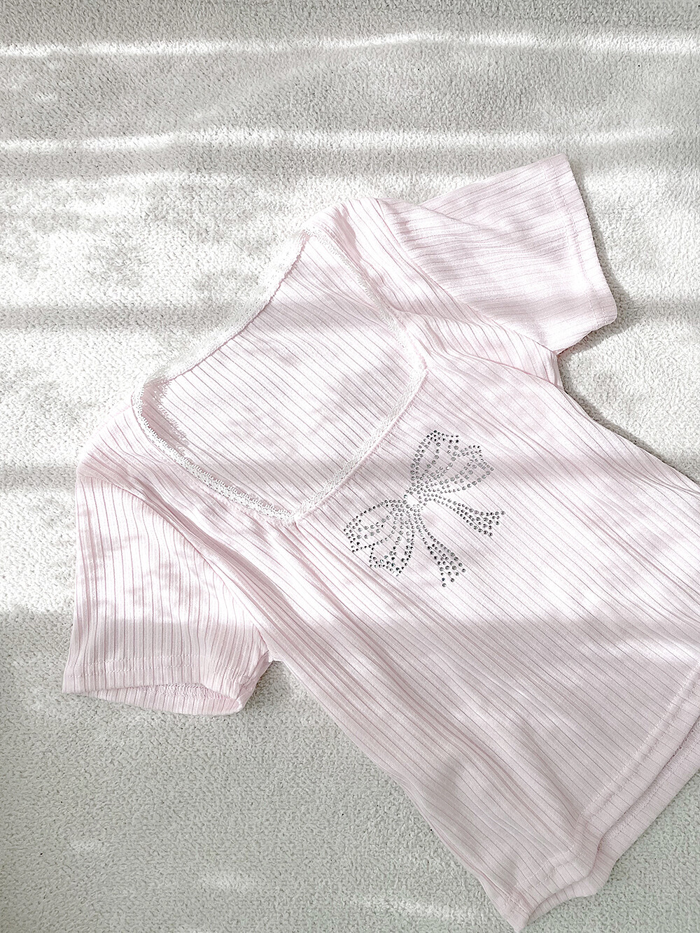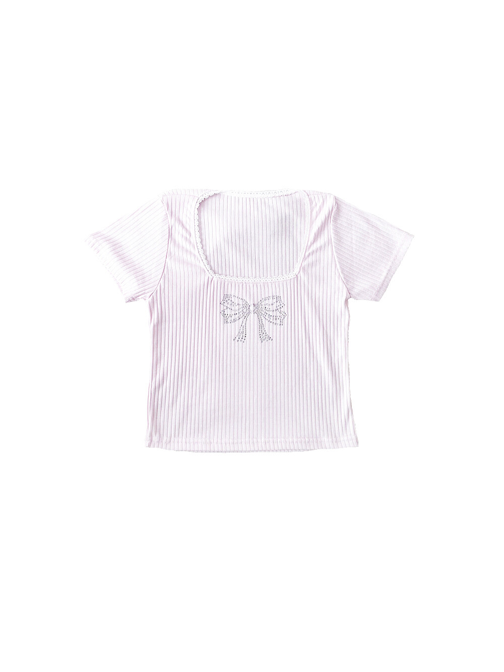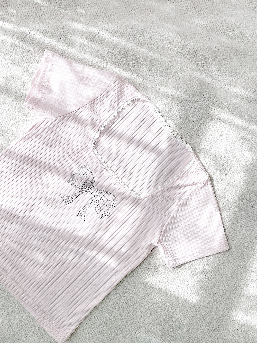 Shine Ribbon Cubic Lace T-Shirt (Baby Pink)