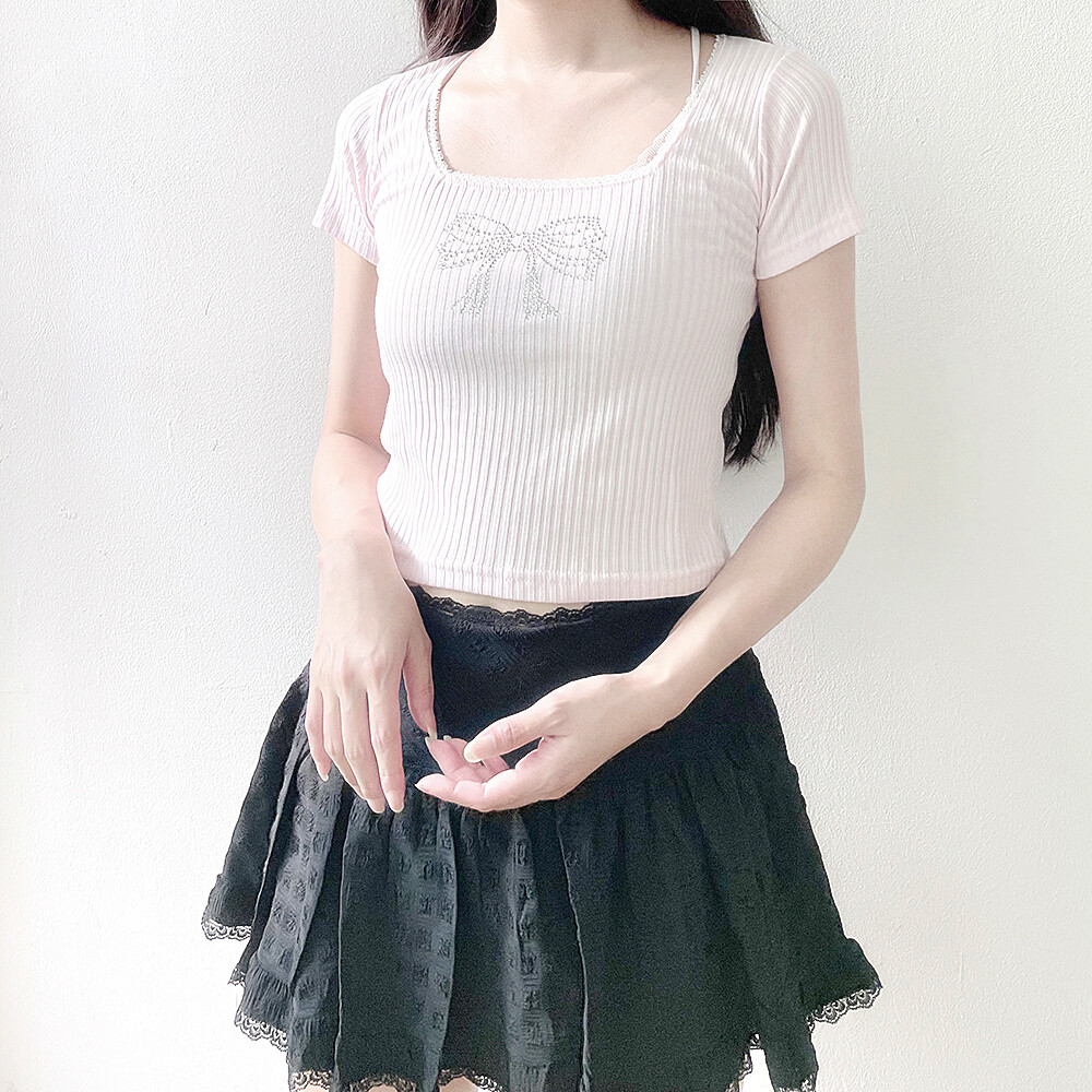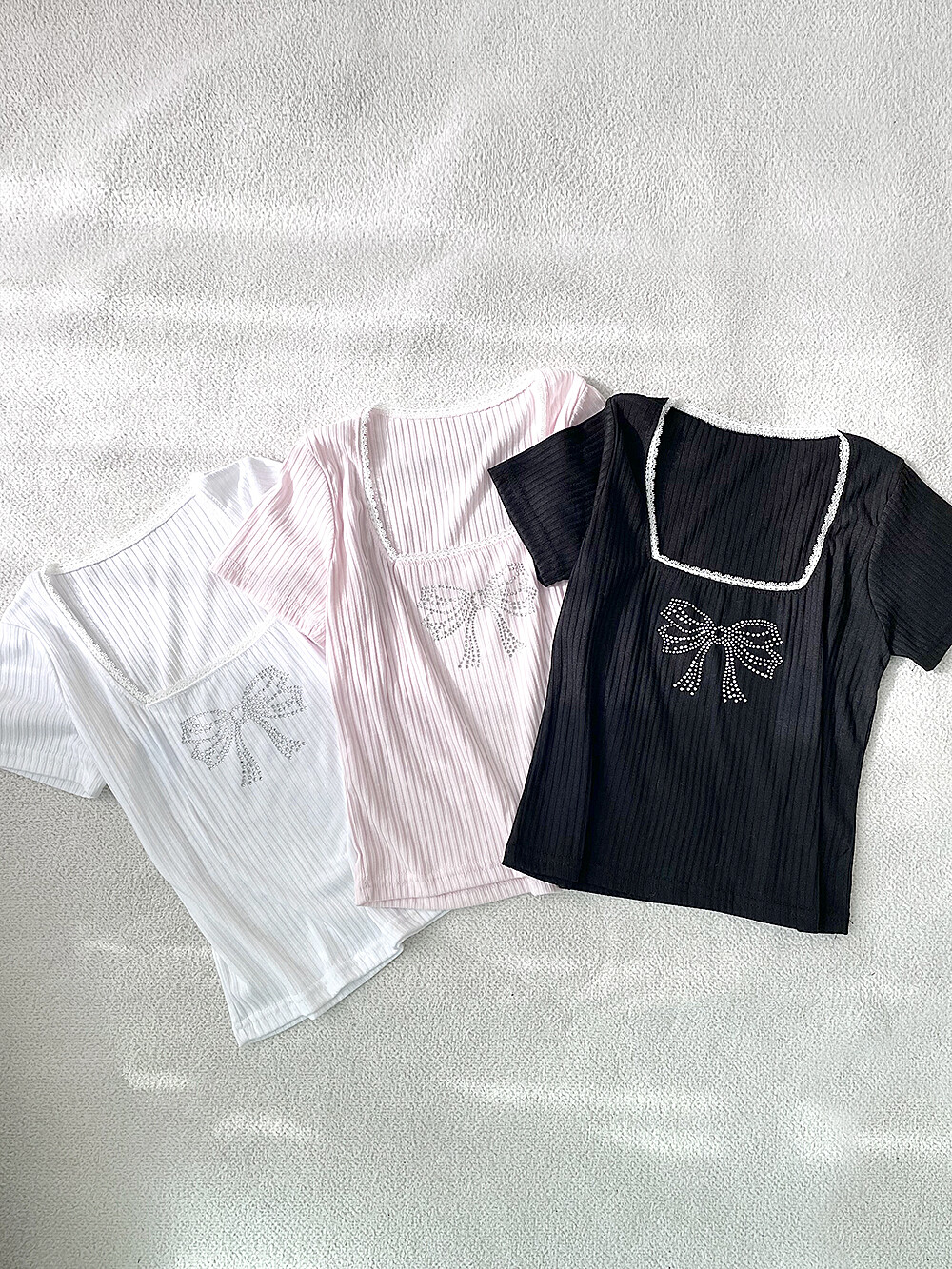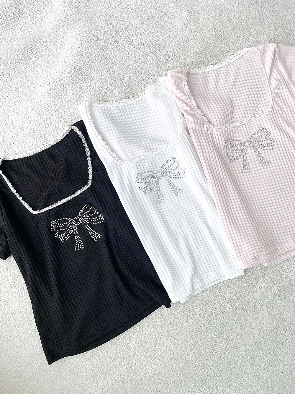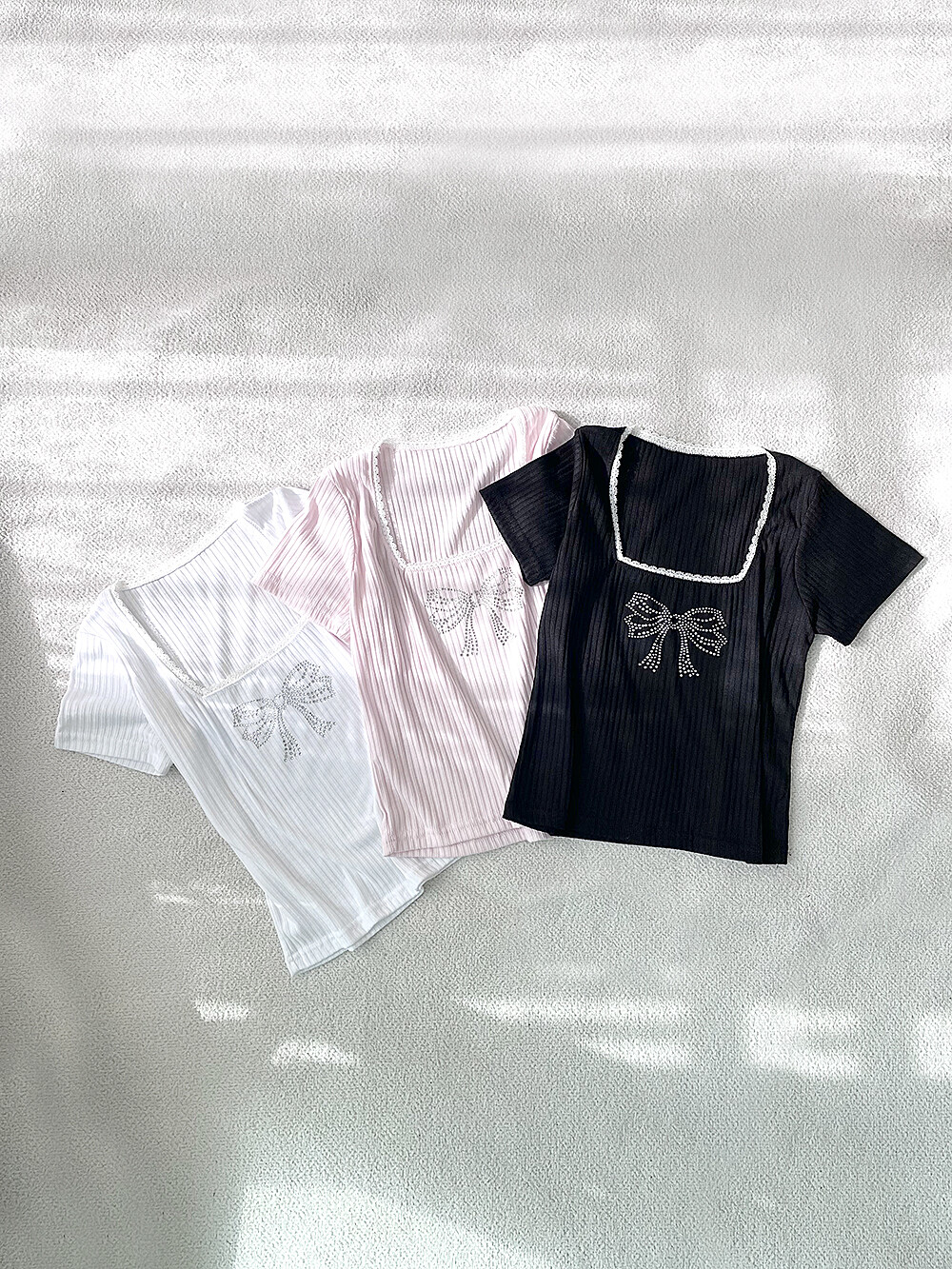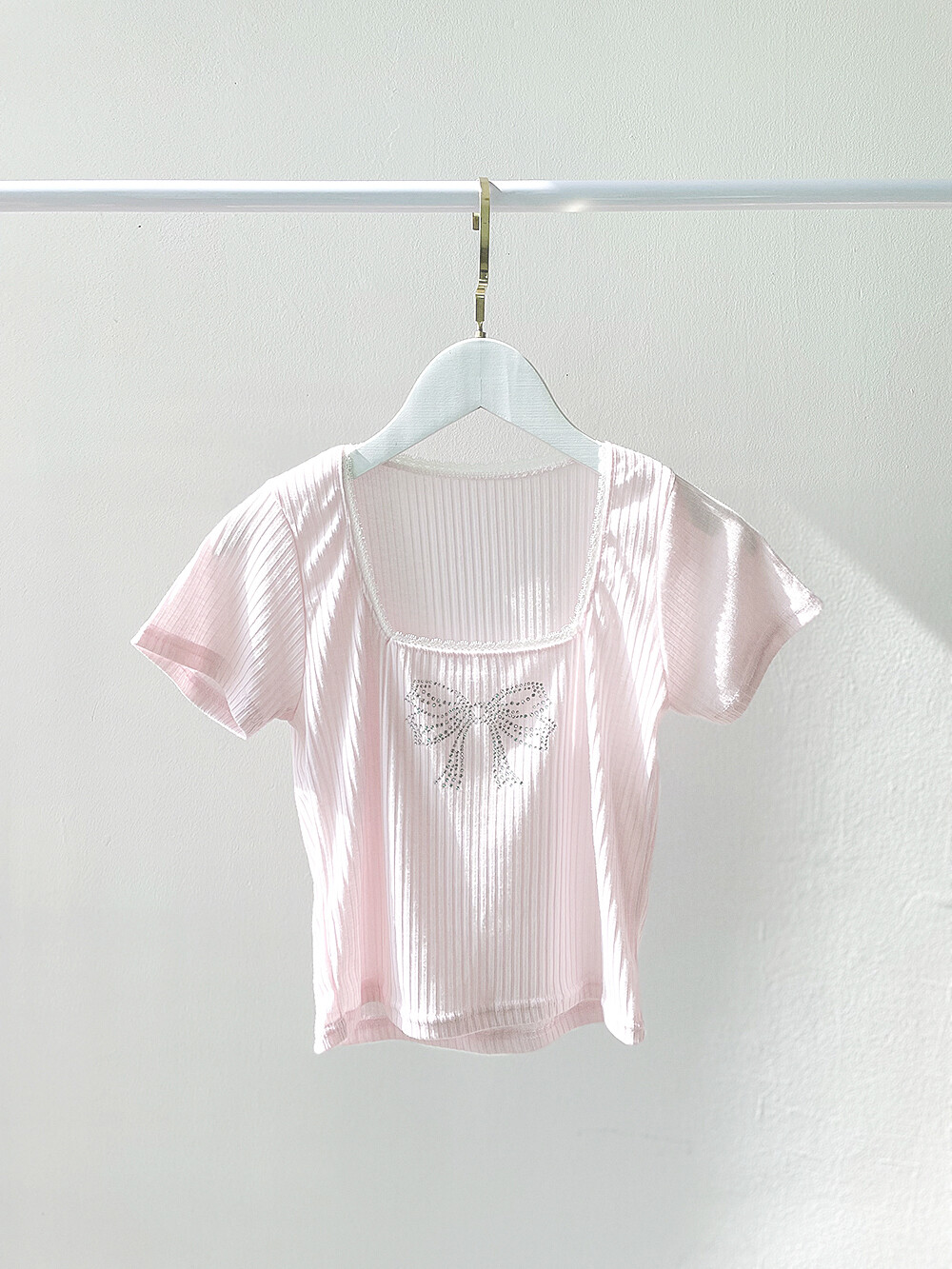 Shine Ribbon Cubic Lace T-Shirt (Baby Pink)