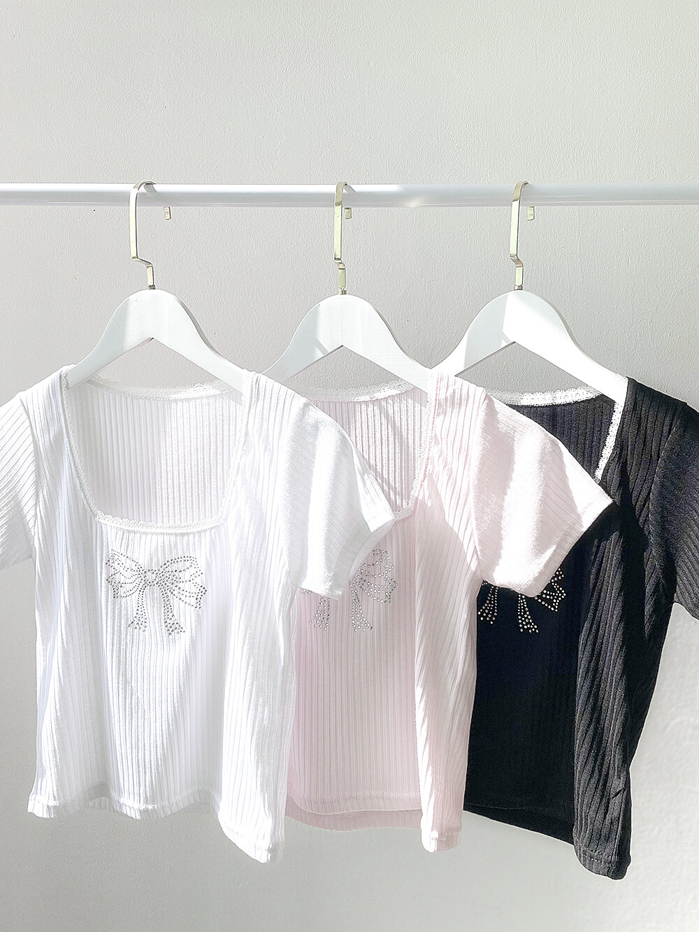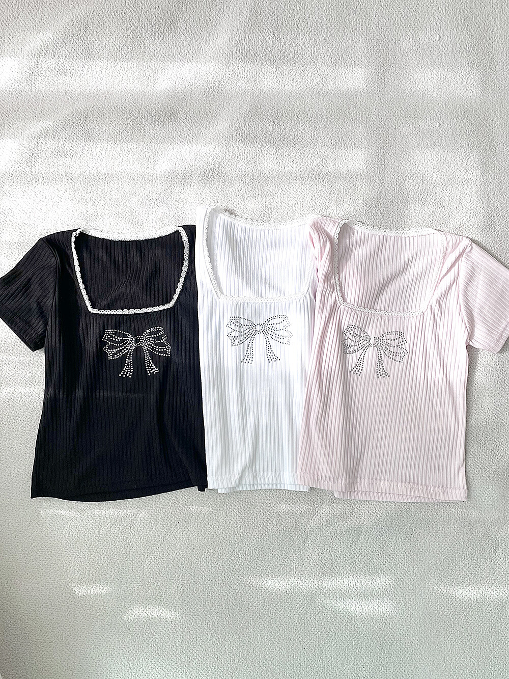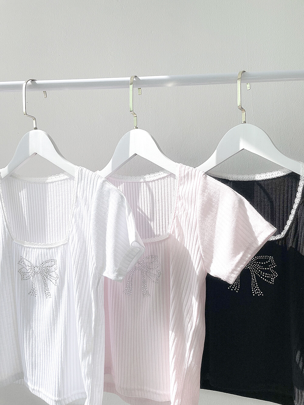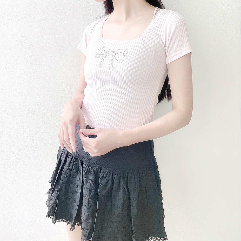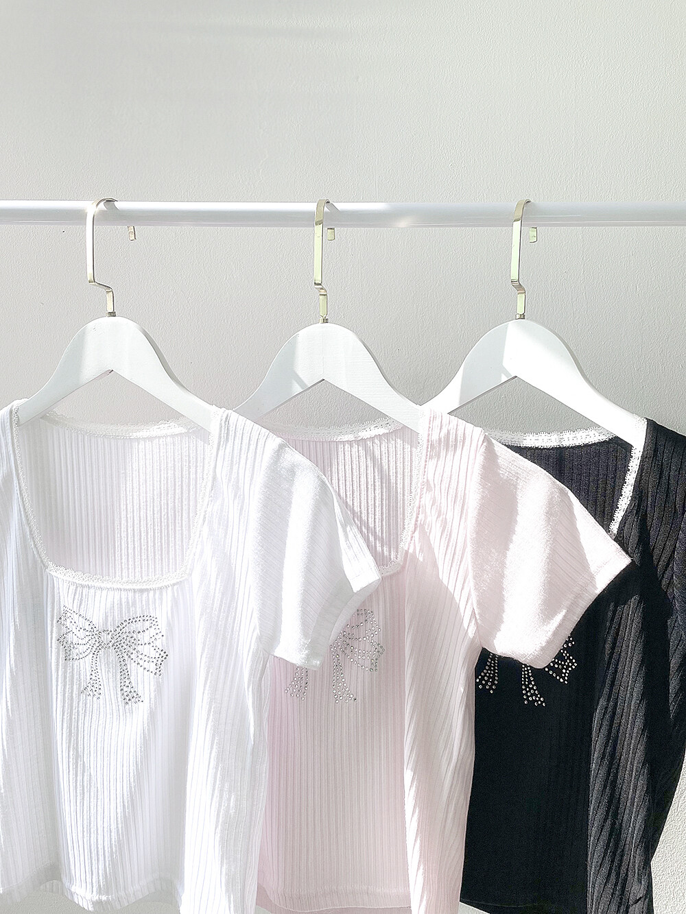 Shine Ribbon Cubic Lace T-Shirt (Baby Pink)