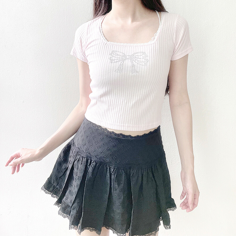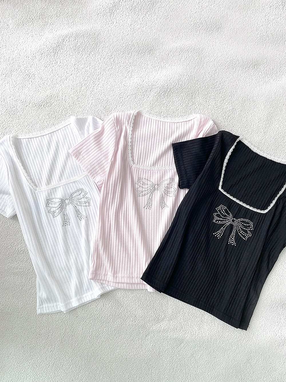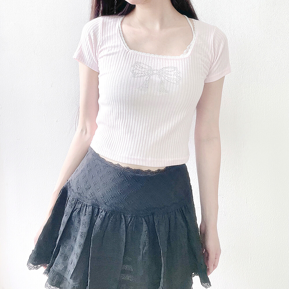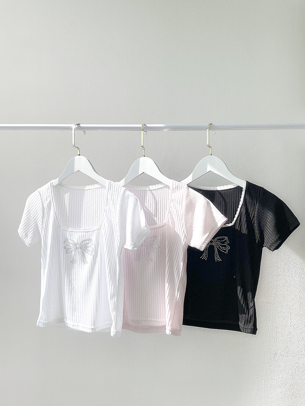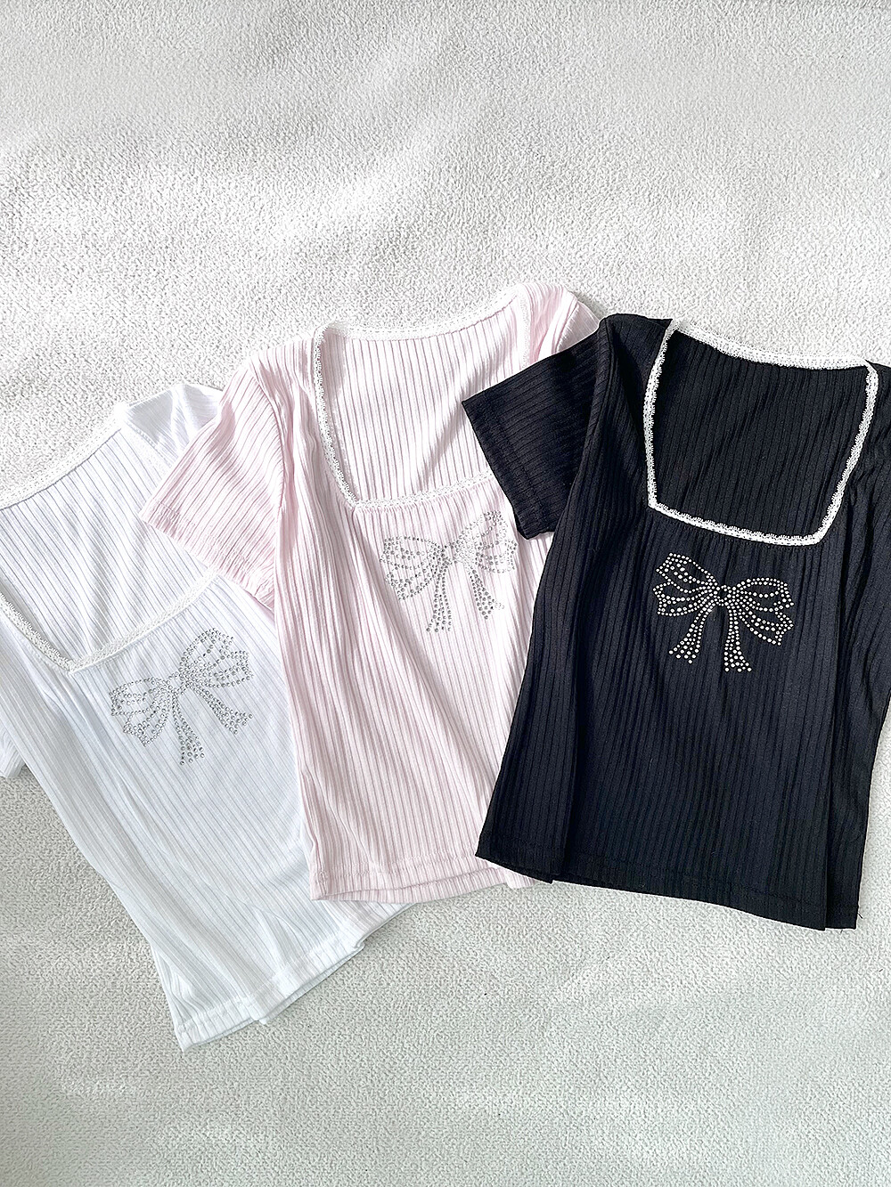 Shine Ribbon Cubic Lace T-Shirt (Baby Pink)