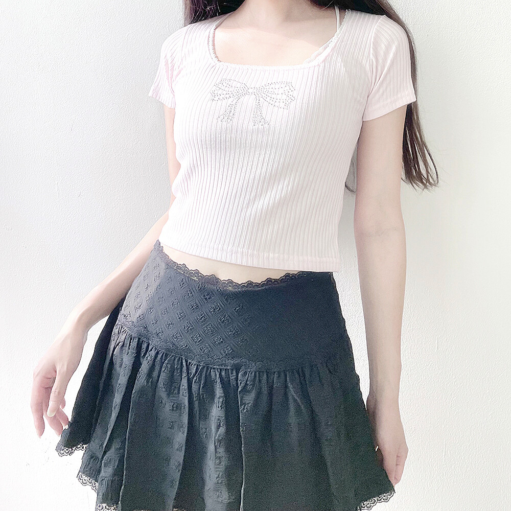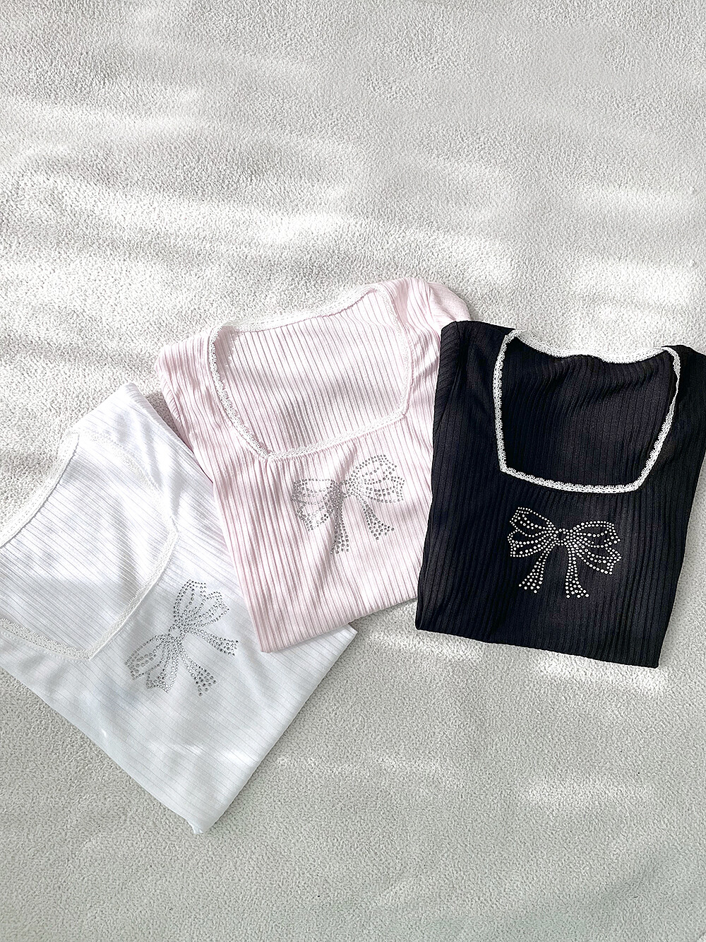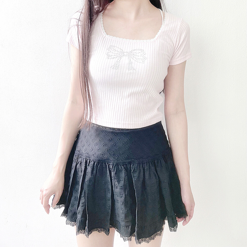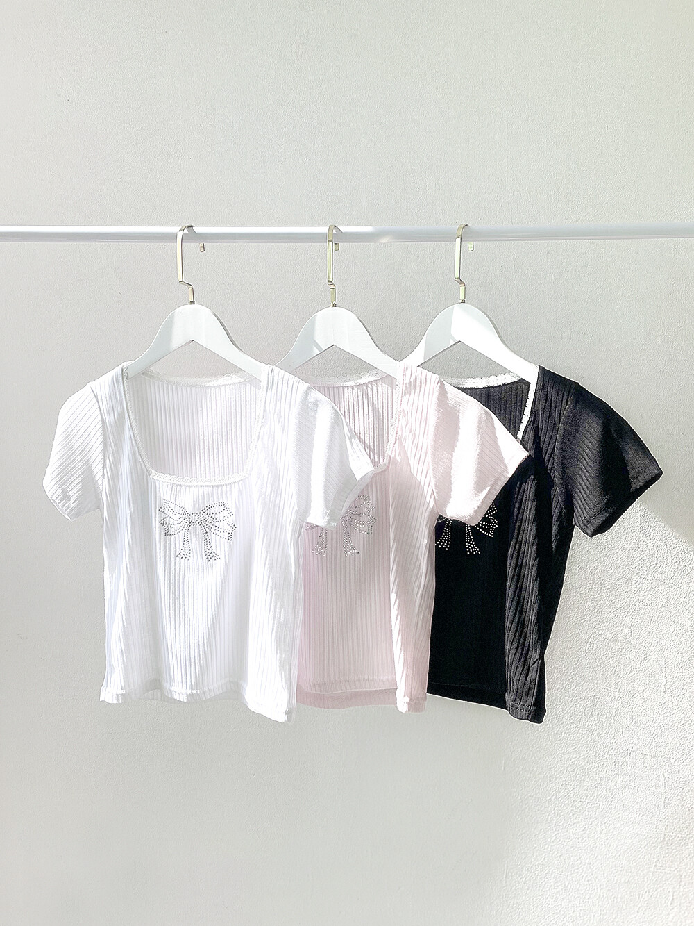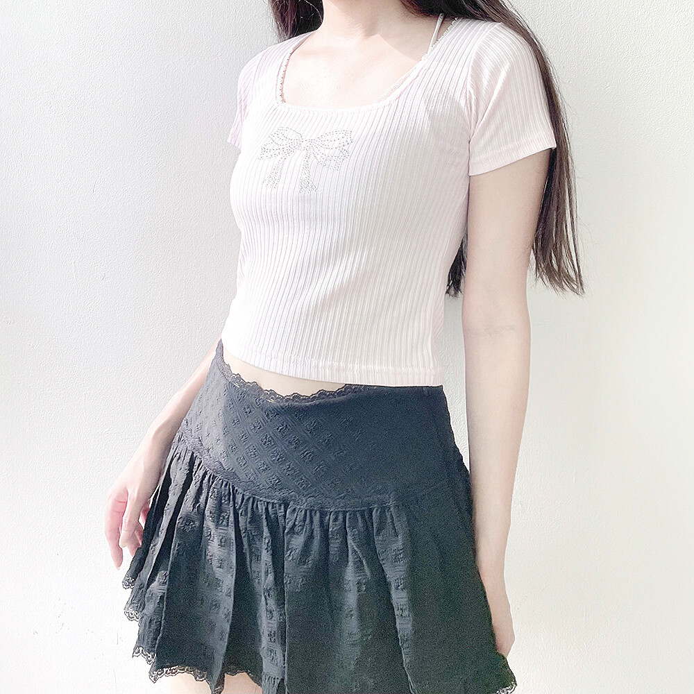 Shine Ribbon Cubic Lace T-Shirt (Baby Pink)