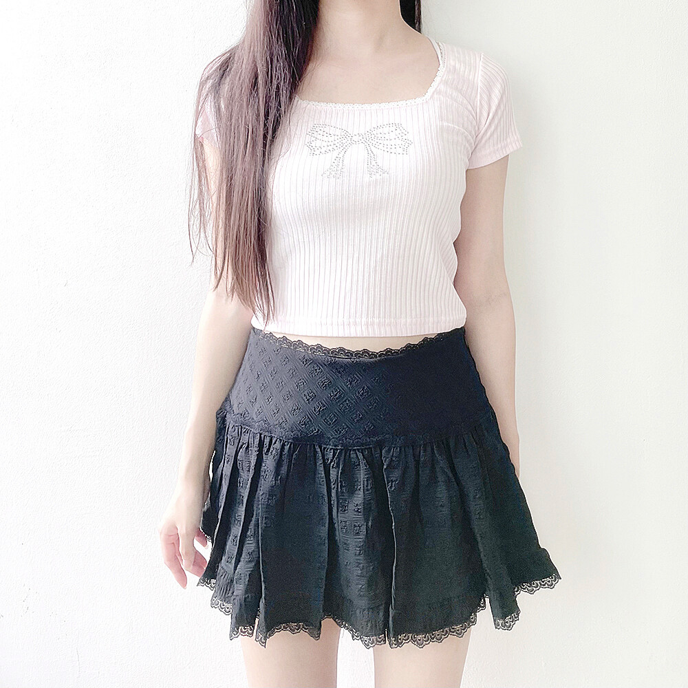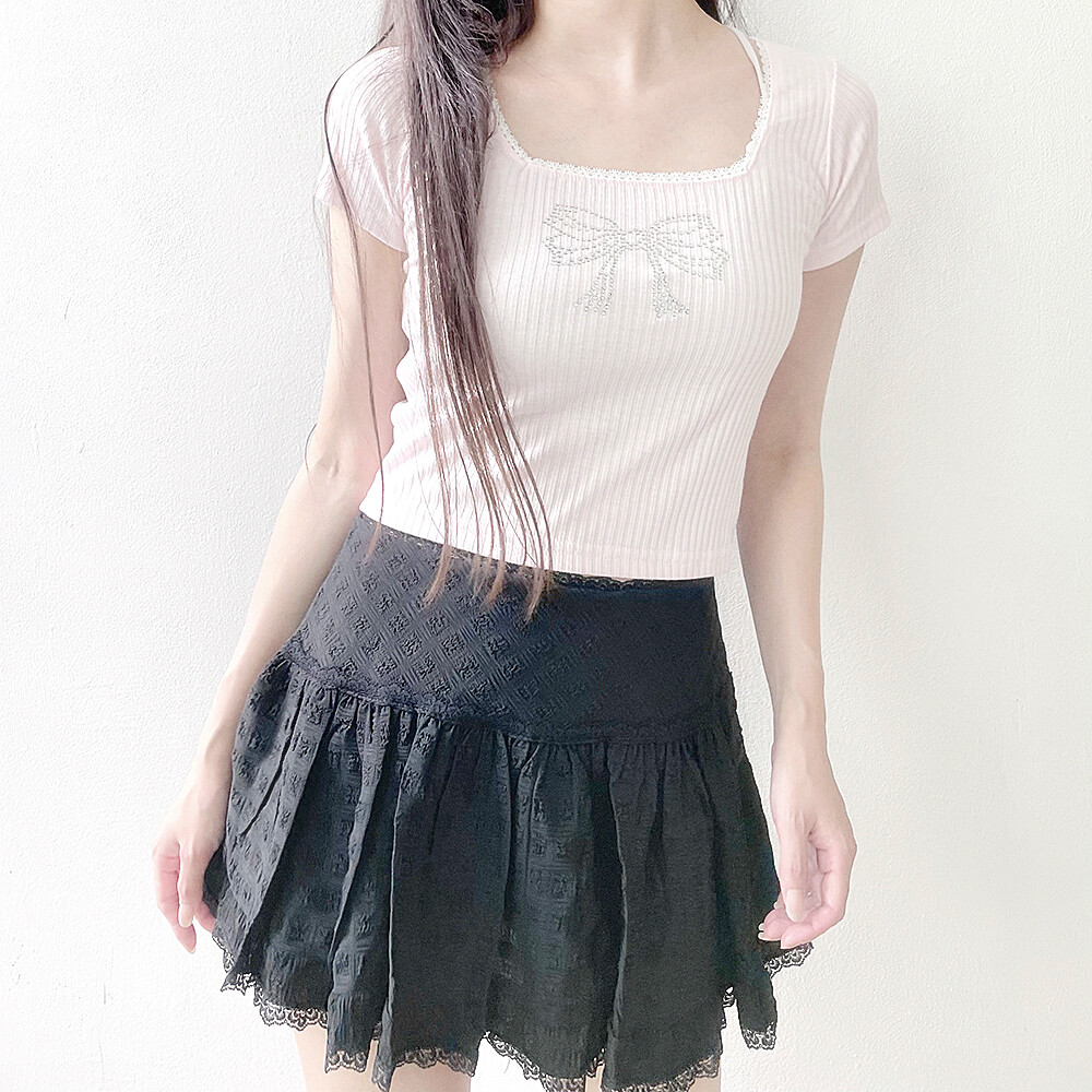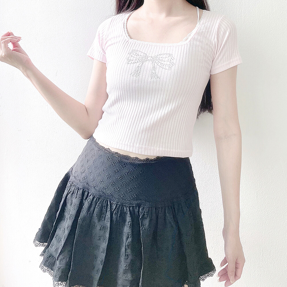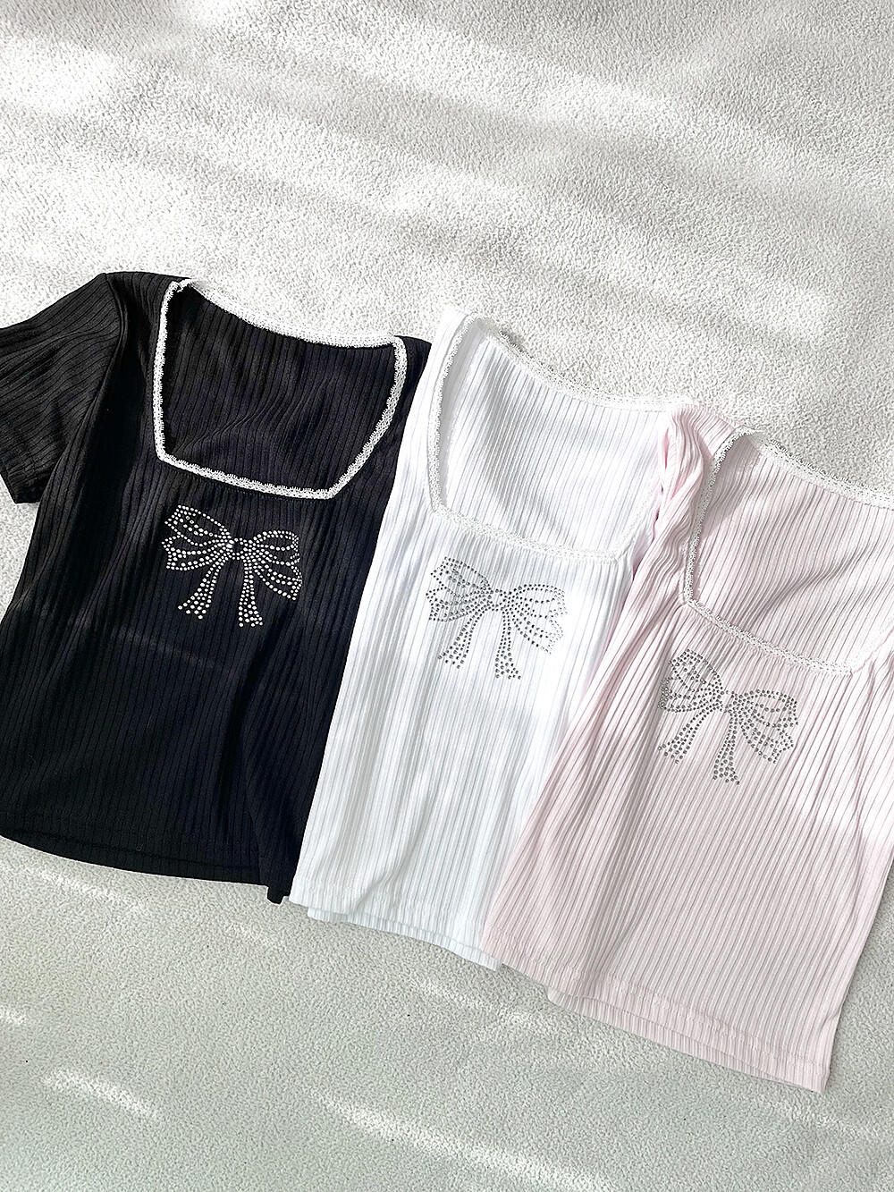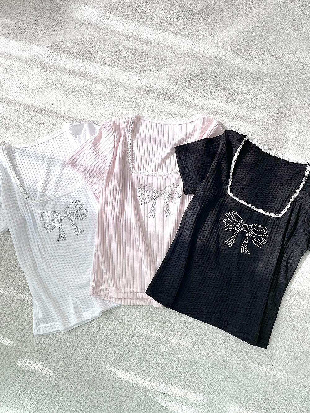 Shine Ribbon Cubic Lace T-Shirt (Baby Pink)