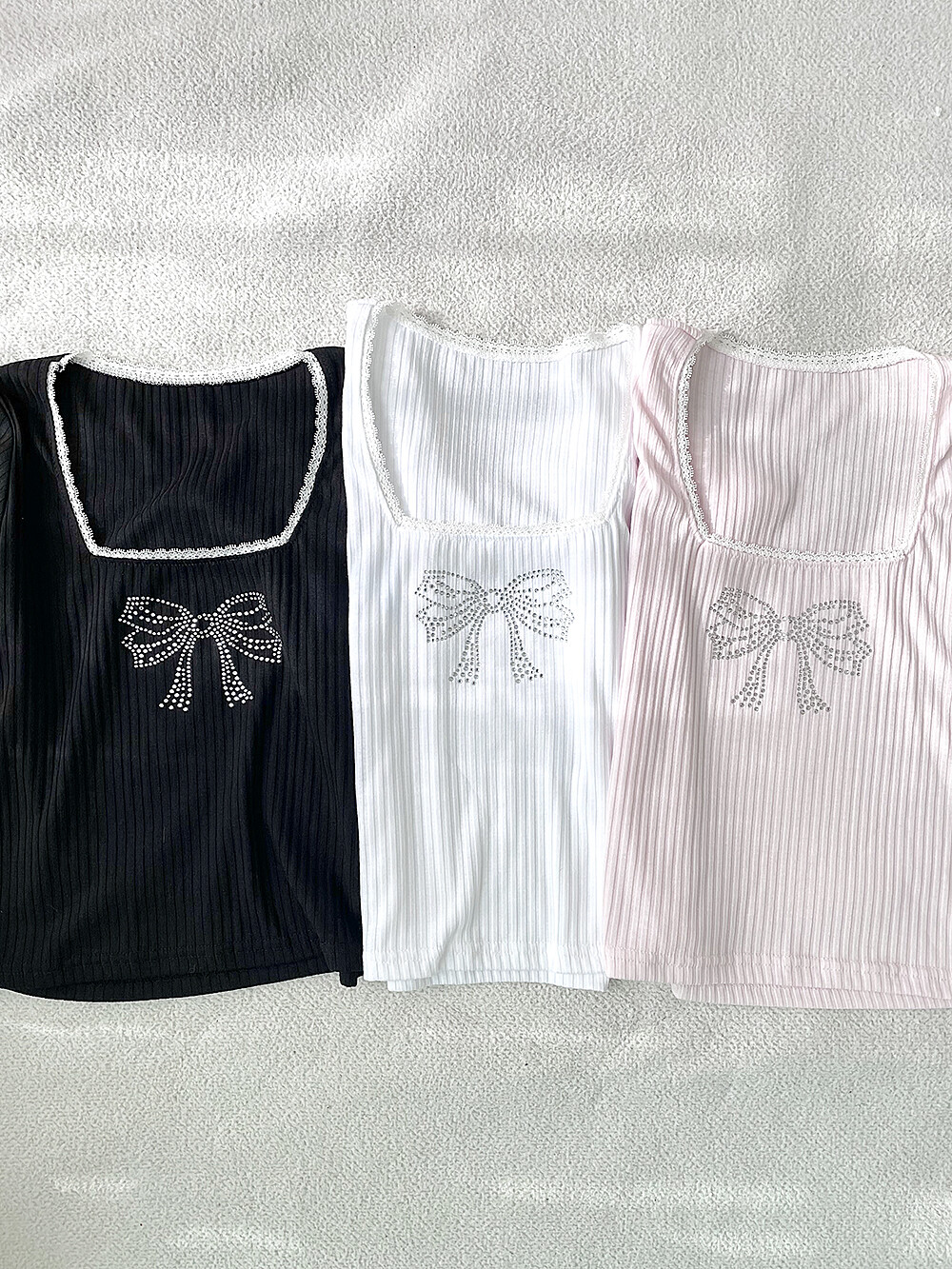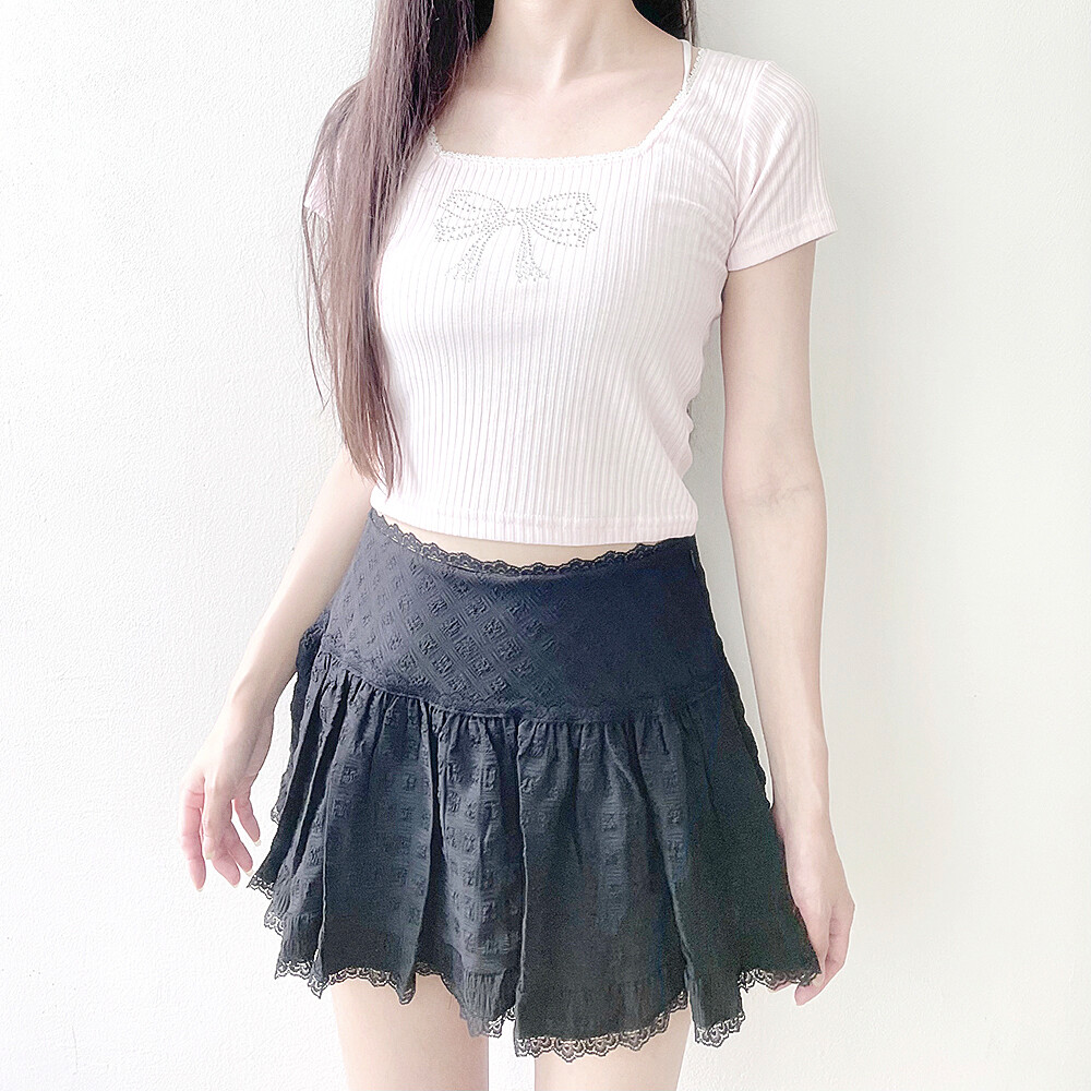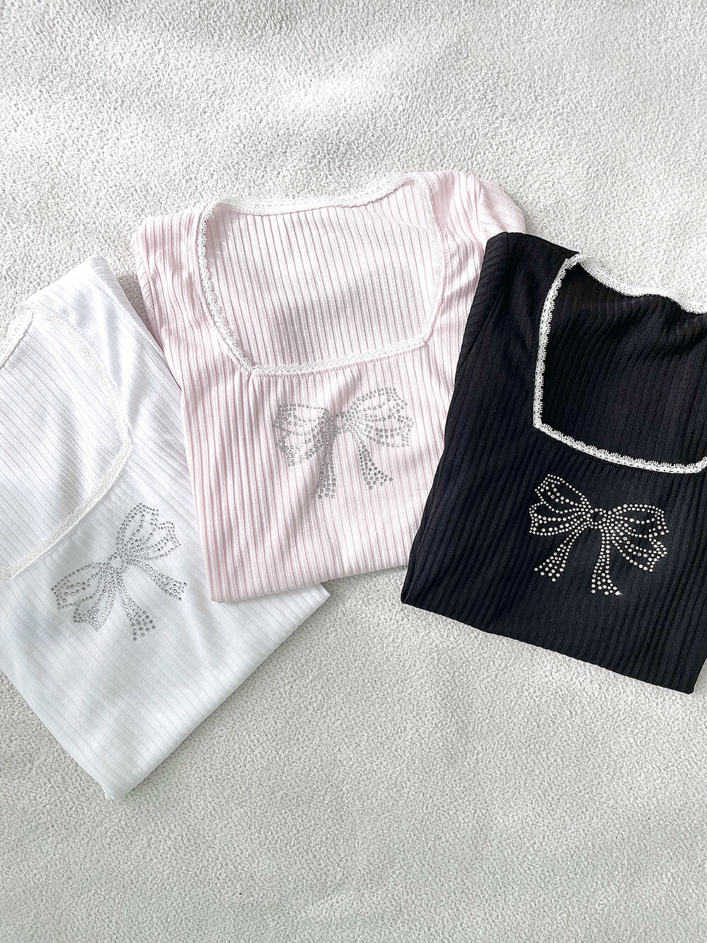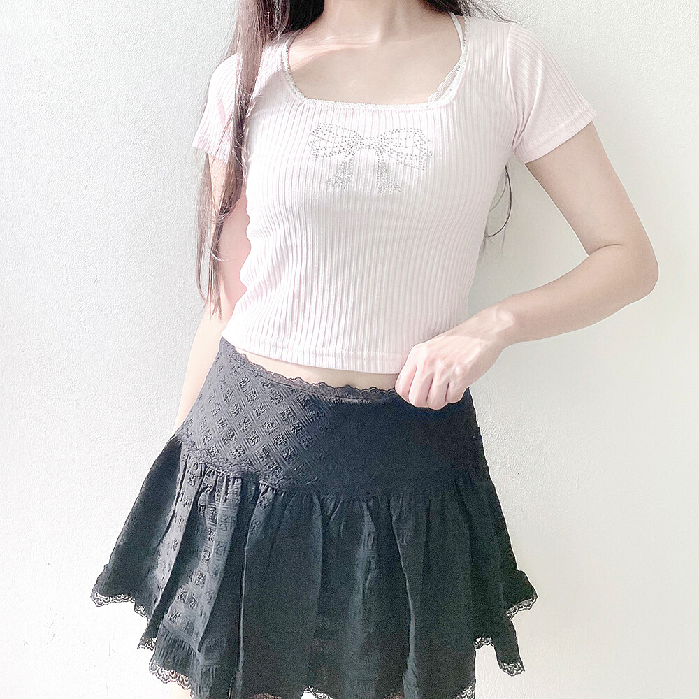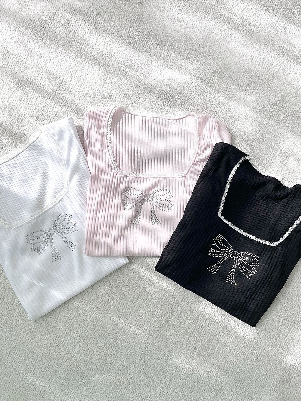 Shine Ribbon Cubic Lace T-Shirt (Baby Pink)